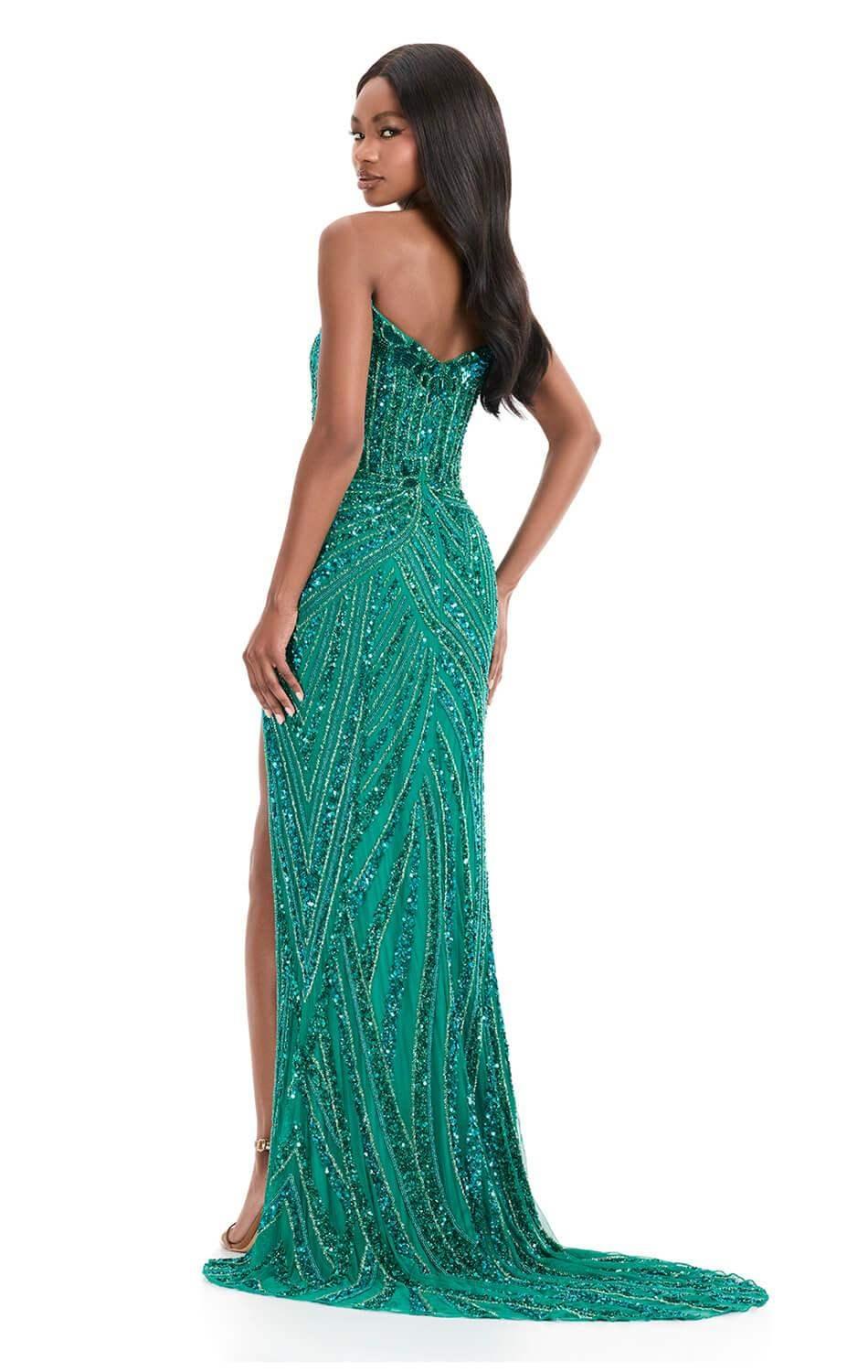 Strapless beaded bustier gown with sweetheart neckline, floral sequin motif, and left leg slit