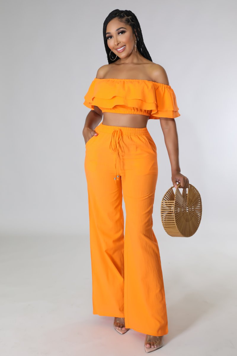 Orange linen two piece pants set with off shoulder crop top and high waist drawstring pants with pockets