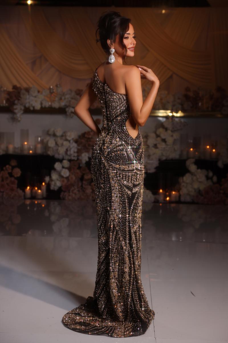 Rhinestone, beaded, and sequin gown with asymmetrical neckline, one shoulder strap with hanging strands of beading, and key hole cut out swirl in the front
