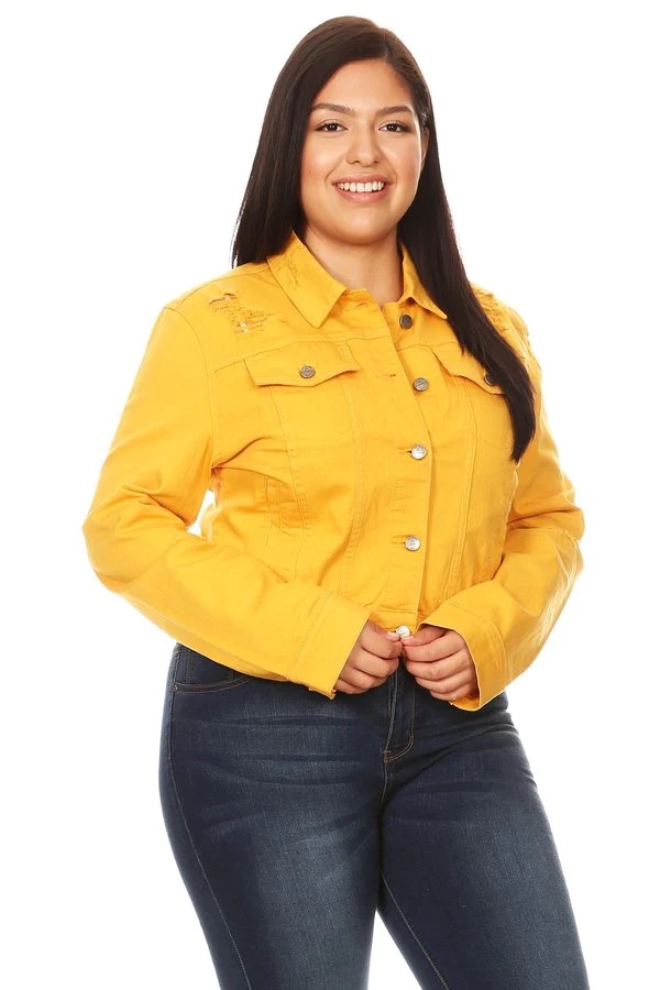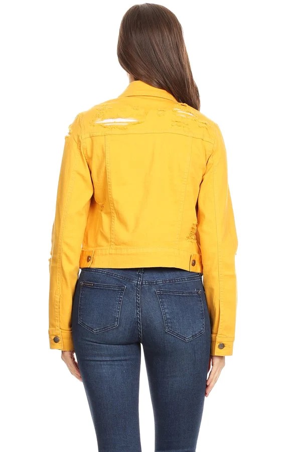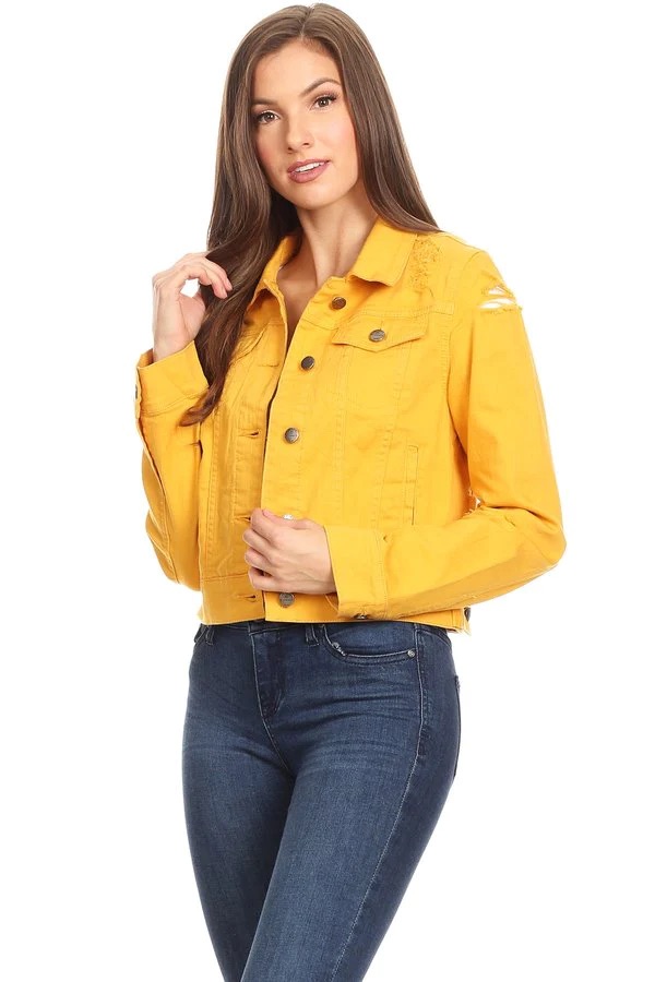 Mustard denim, waist length jacket in a loose fit with a rolled collar, button up closures, long sleeves, ripped details, and front pockets