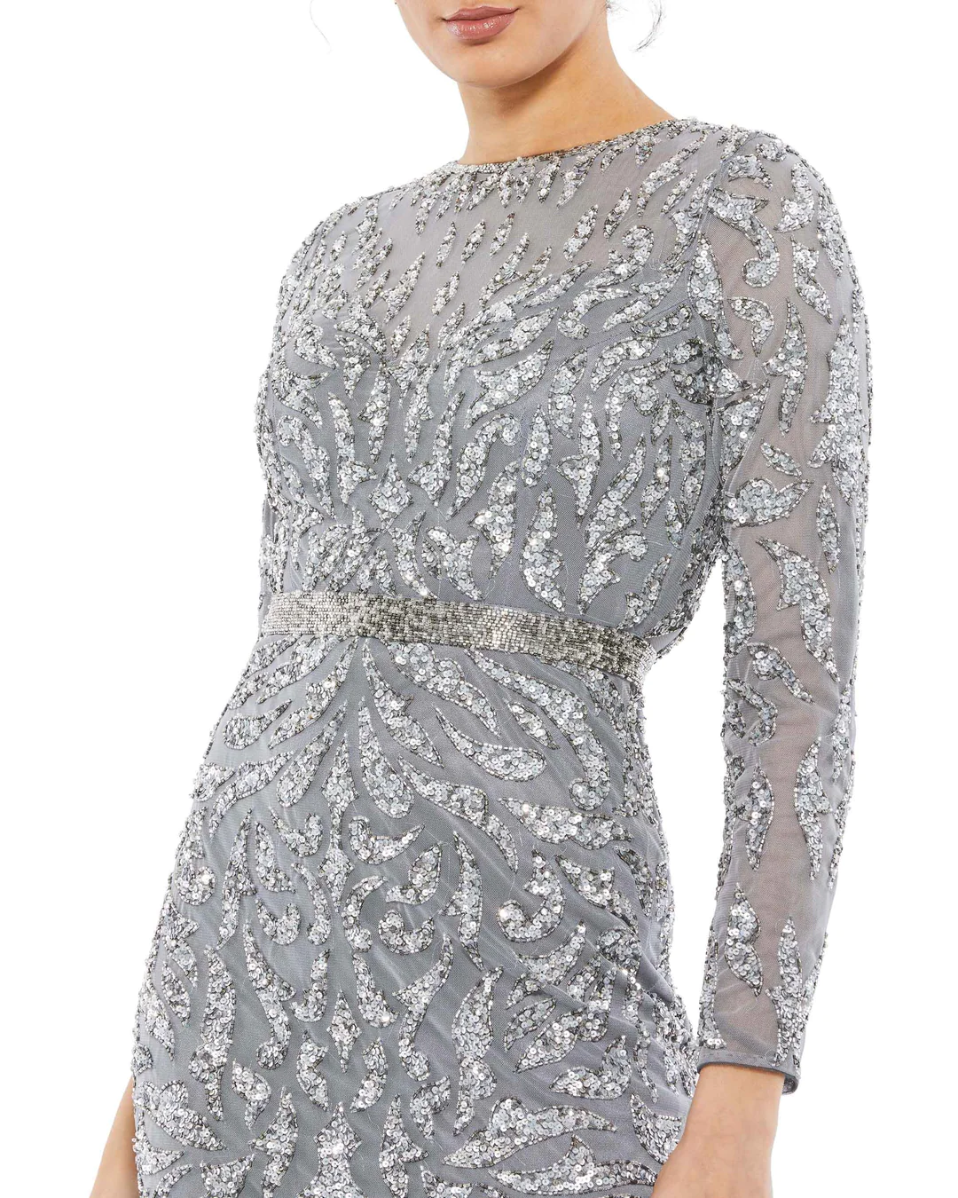 Sequined and beaded long sleeve sheath dress with round neckline, beaded waistline, and back slit
