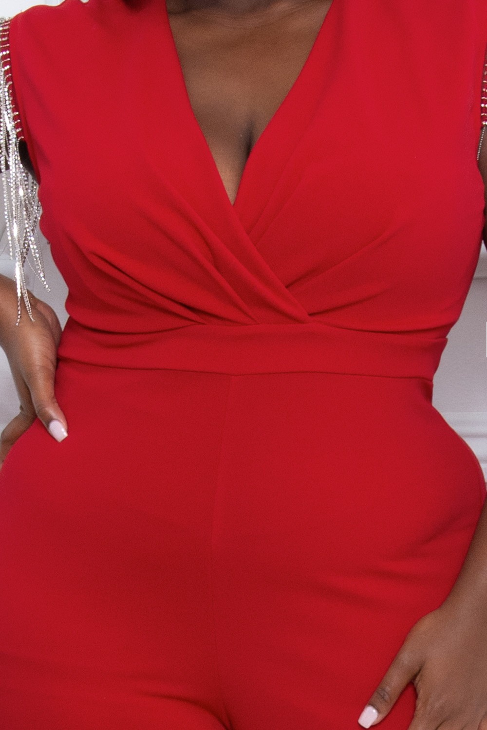 Plus size jumpsuit with crystal and metal chain fringe sleeves