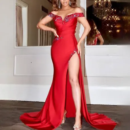 Red off-the-shoulder gown with v-neck, embroidered neckline and waist, and high leg slit