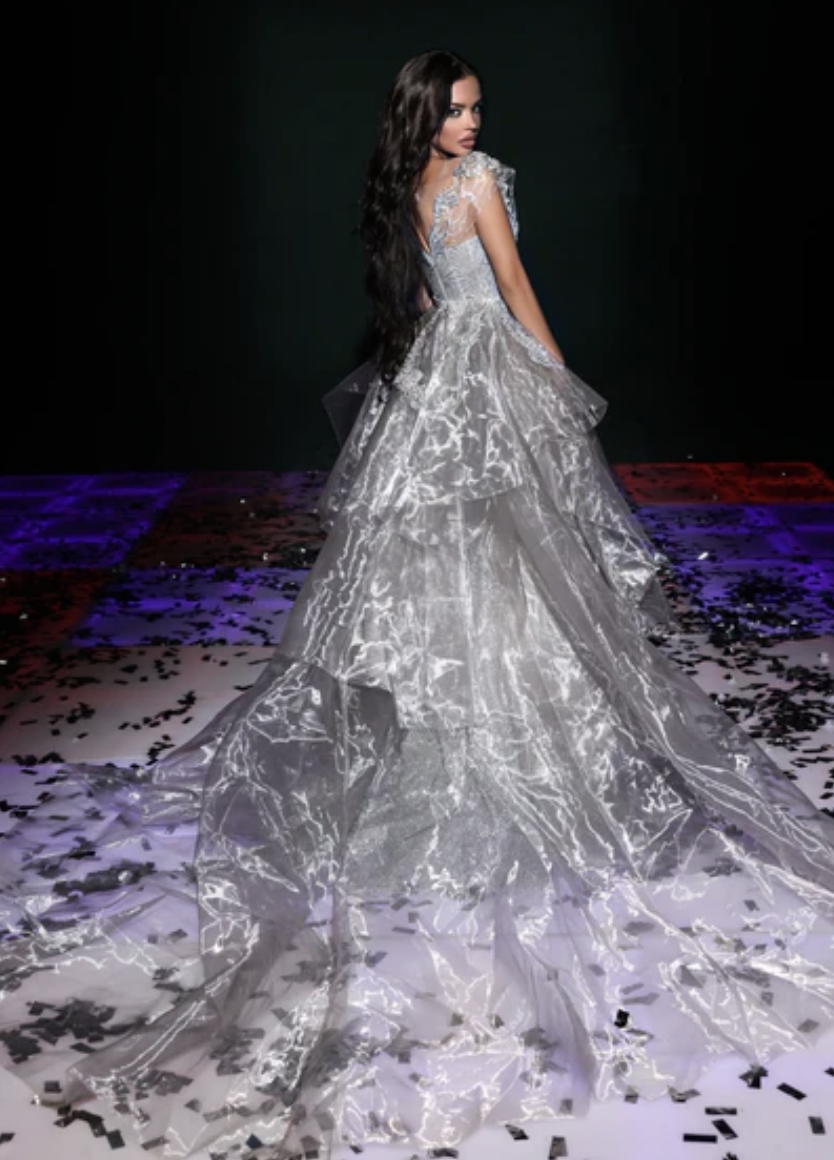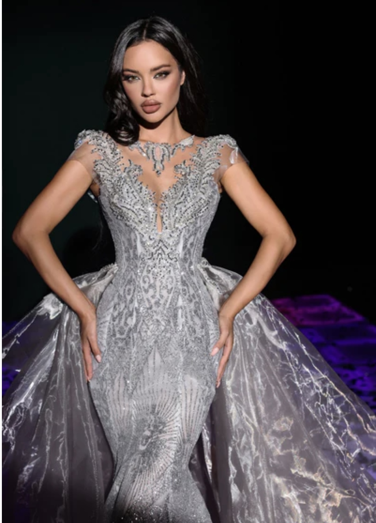 Silver high illusion neckline gown with beaded cap sleeves, intricate beadwork and shimmering cracked ice detail, and gorgeous organza overskirt