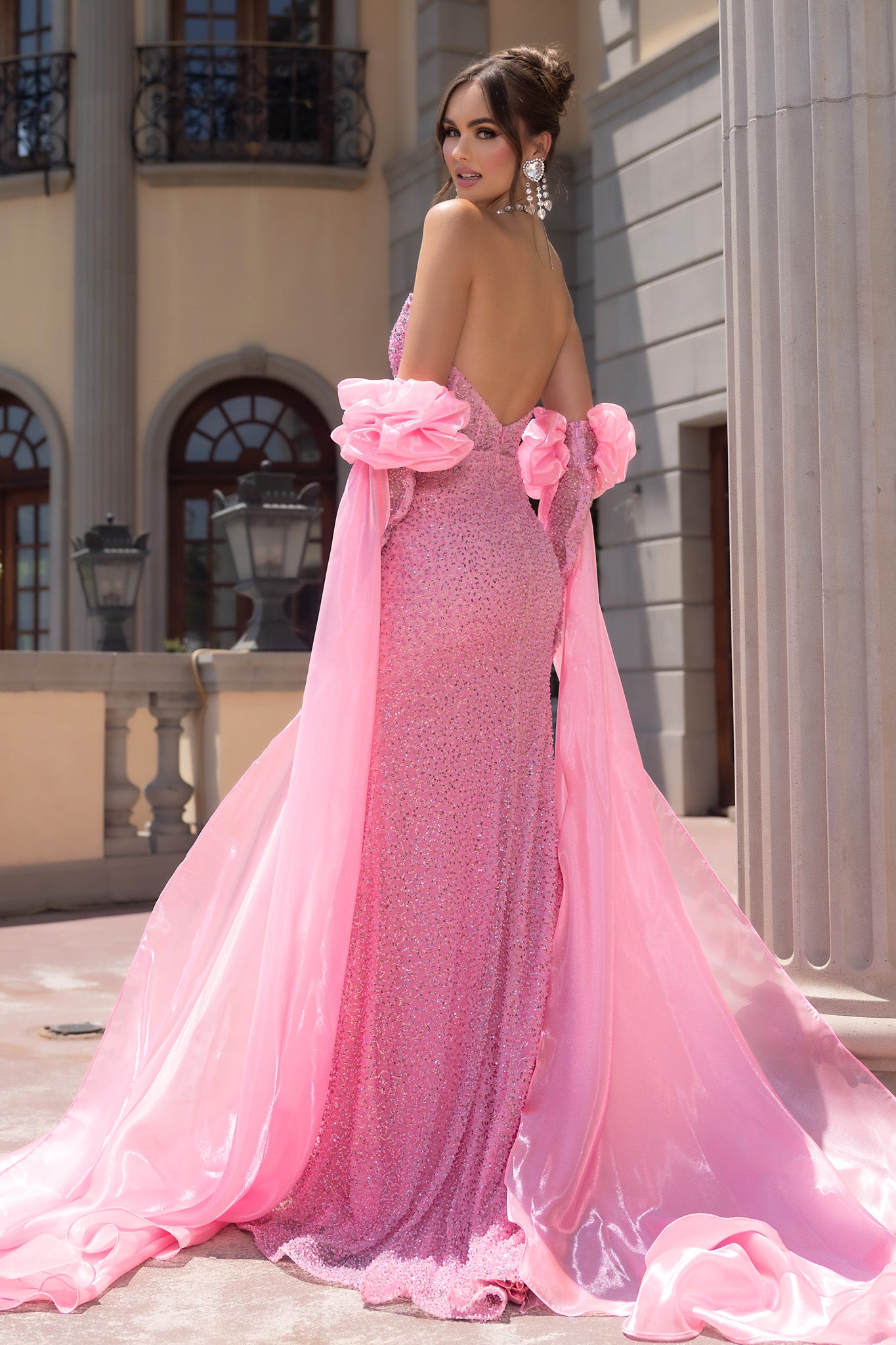 Beaded mesh corset gown with strapless curved neckline, matching opera gloves with puff tops and floor-sweeping streamers, and thigh-high slit