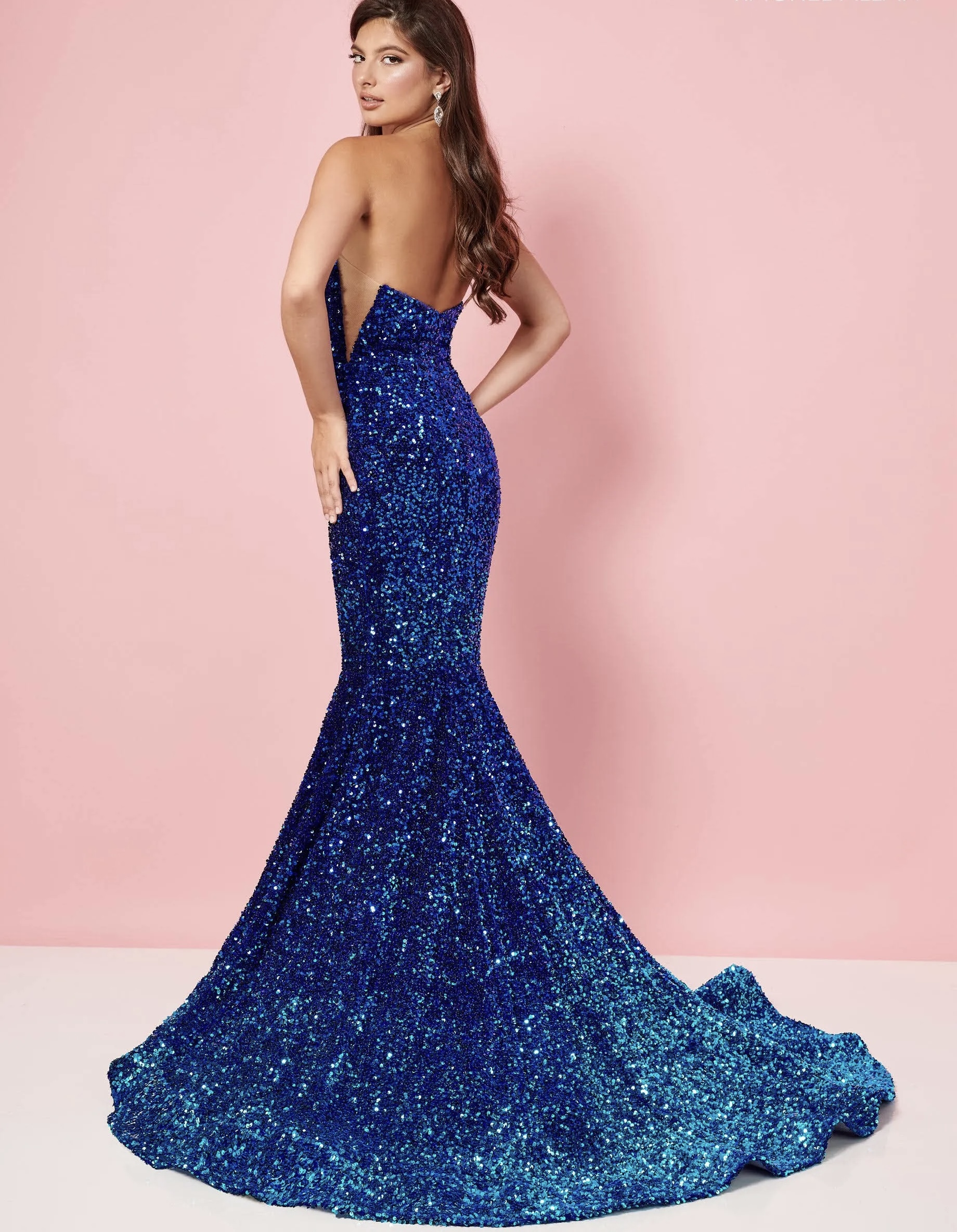 Ombré sequined velvet A-line gown with a unique plunging neckline and sheer cut out sides