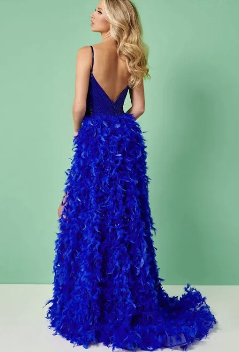 Royal blue striped beaded gown with front and back deep V-neckline, side slit, and a feathered majestic overskirt