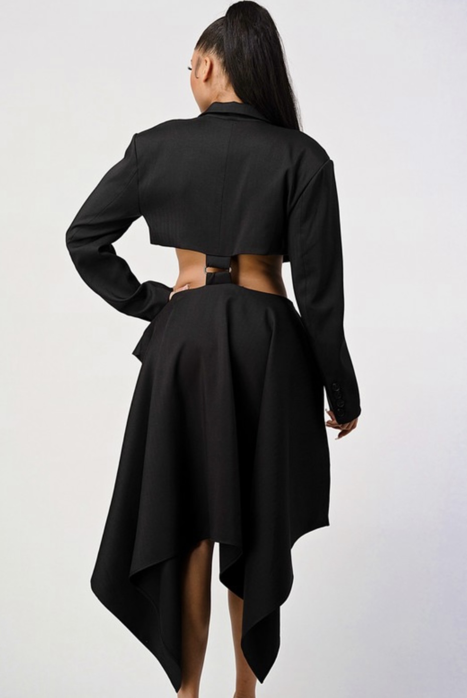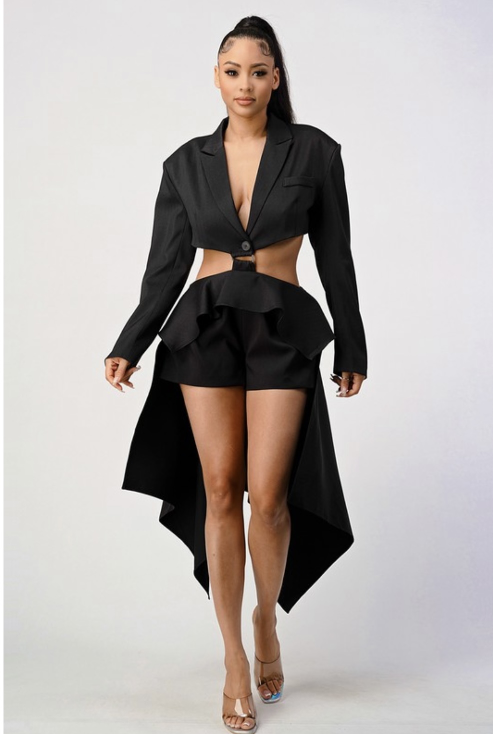 Romper with detachable jacket and shorts with high fashion tail and open sides