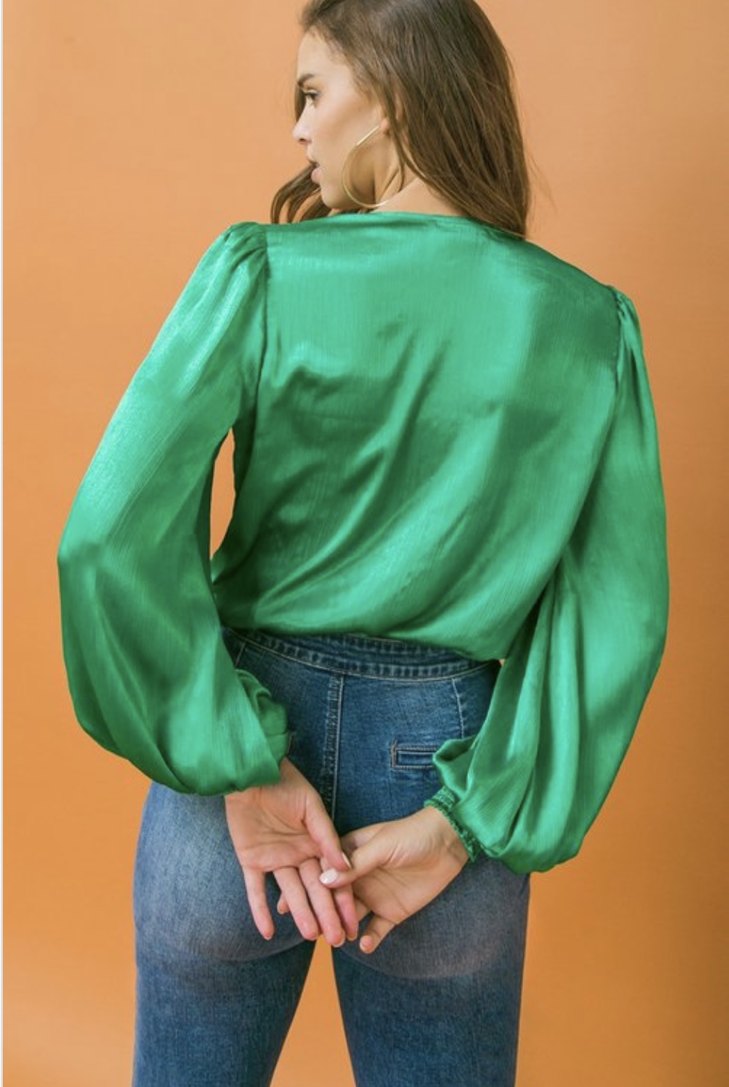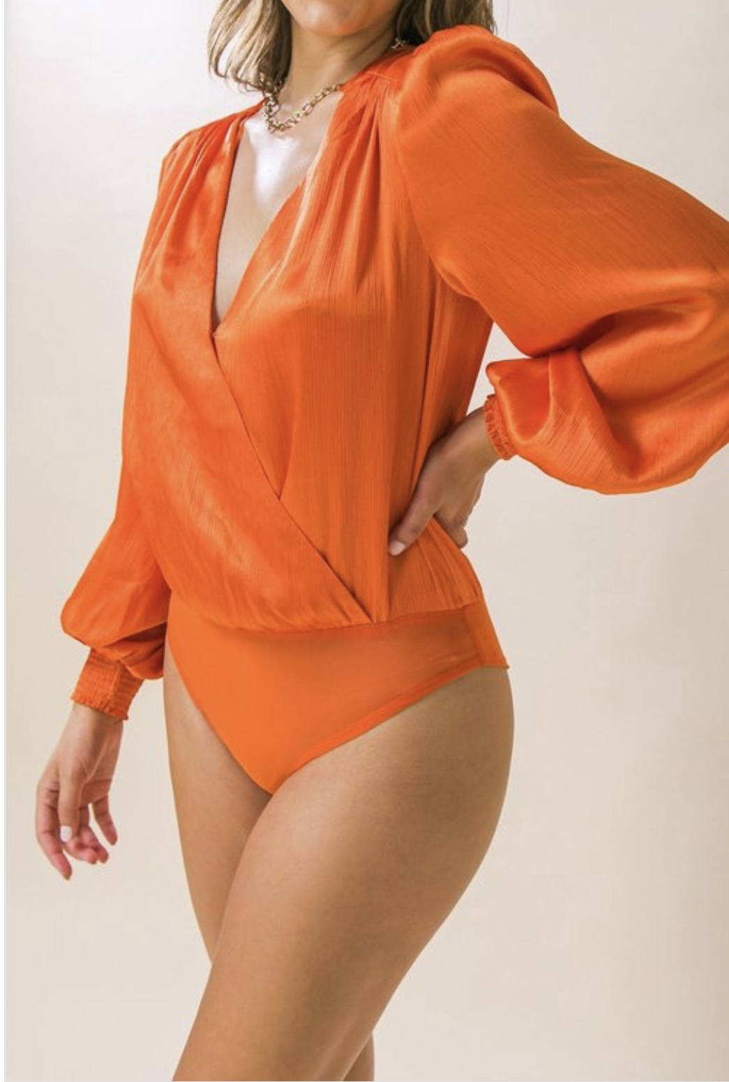 Woven bodysuit with surplice neckline, puff long sleeve with smocked cuff, and mesh bikini with bottom snap closure